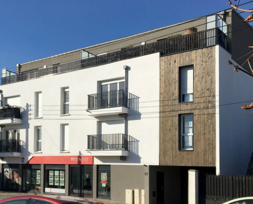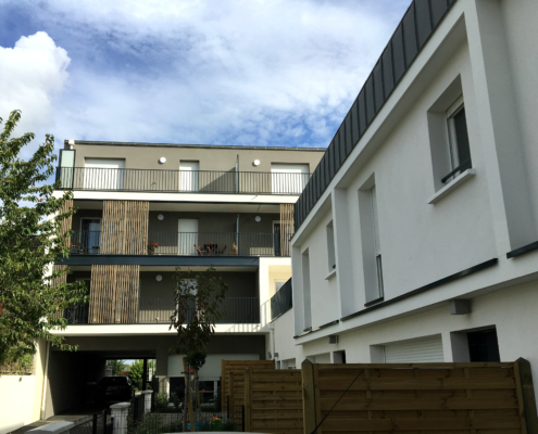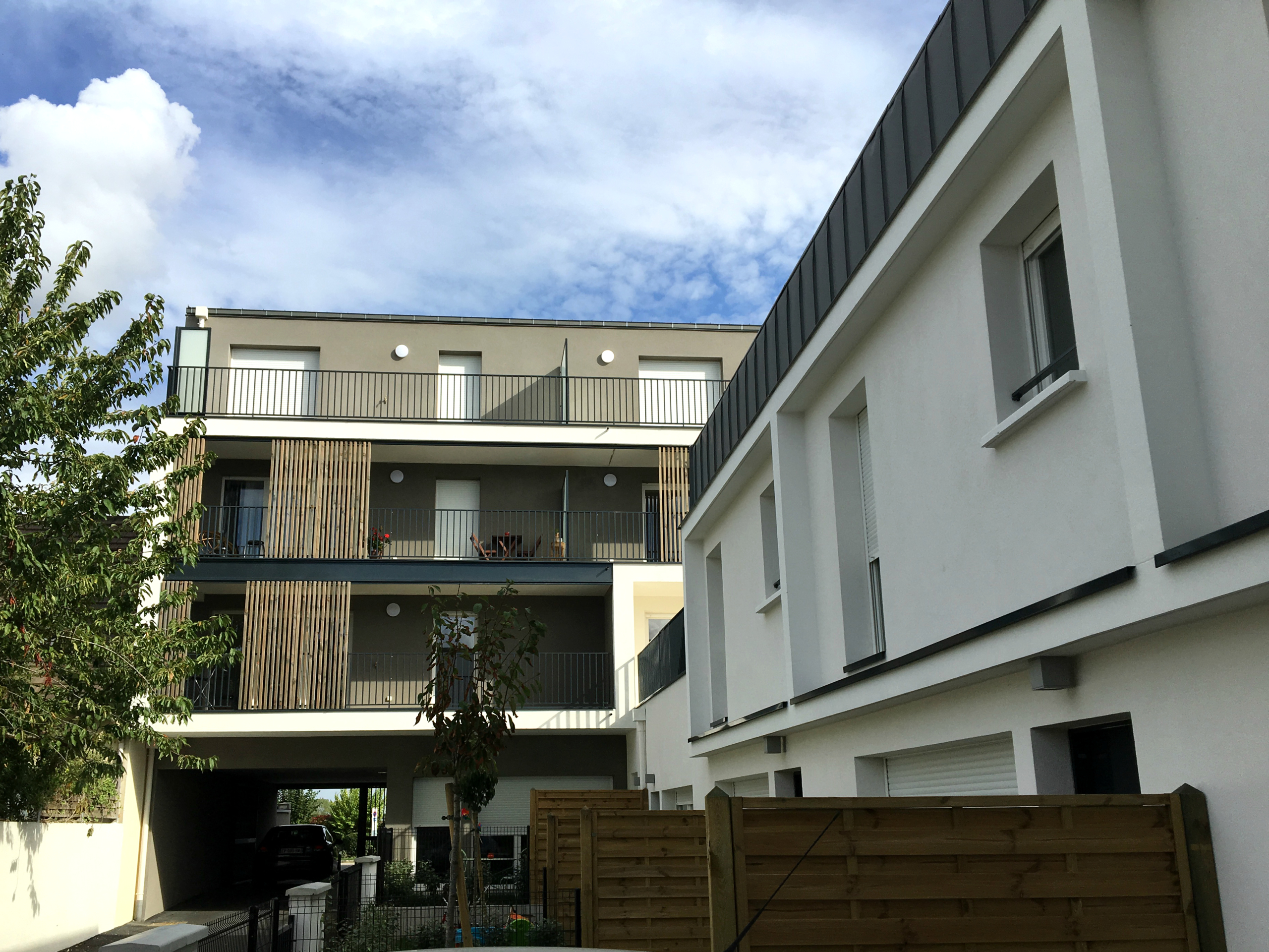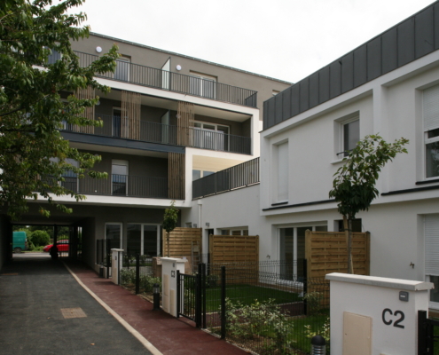 L’architecture de l’ensemble est caractérisée par des volumes simples et nettement démarqués par l’emploi de matériaux différents et pérennes (acier thermolaqué, enduits talochés, bardage et volets persiennés bois) lui offrant ainsi une lecture claire. Différentes tonalités de matériaux permettent de séquencer verticalement les immeubles en leur offrant un soubassement, un corps principal et un attique.